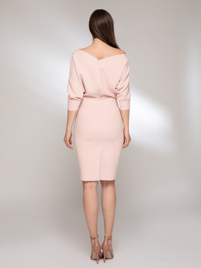 The dress features draping at the waist, and the closure system is provided by a hidden zipper.