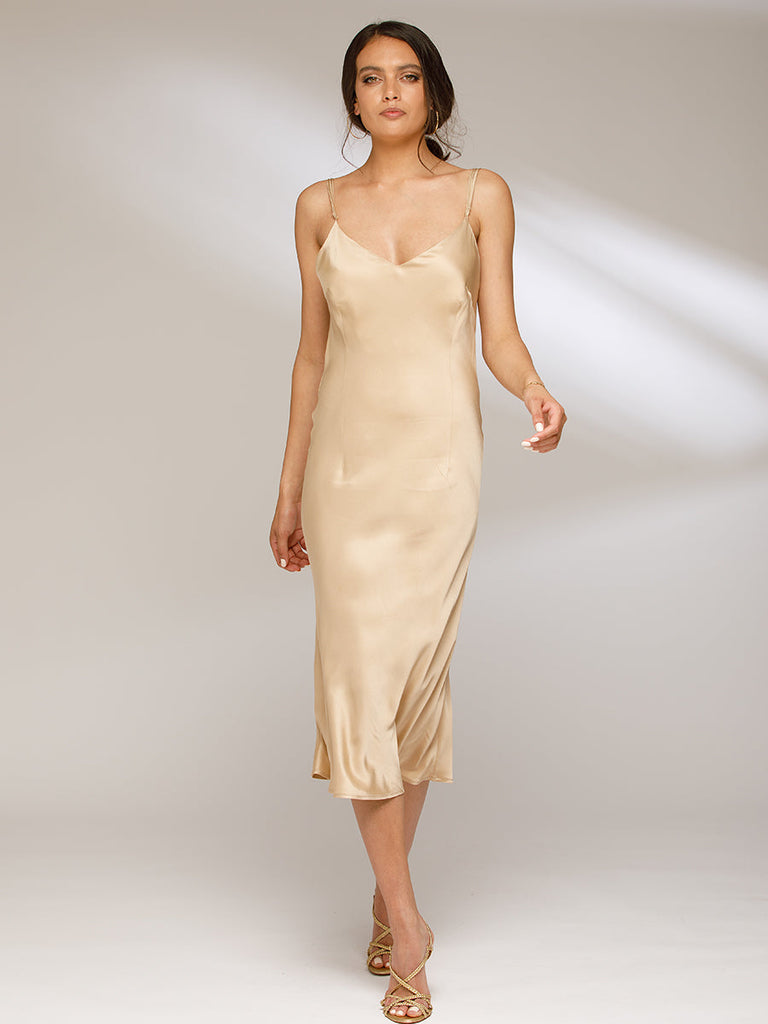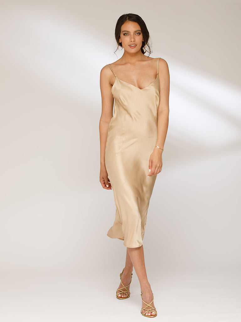 The dress has a bias cut, and the straps have metal rings that help adjust the length.