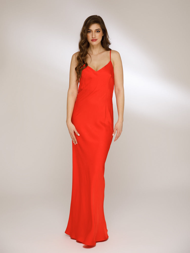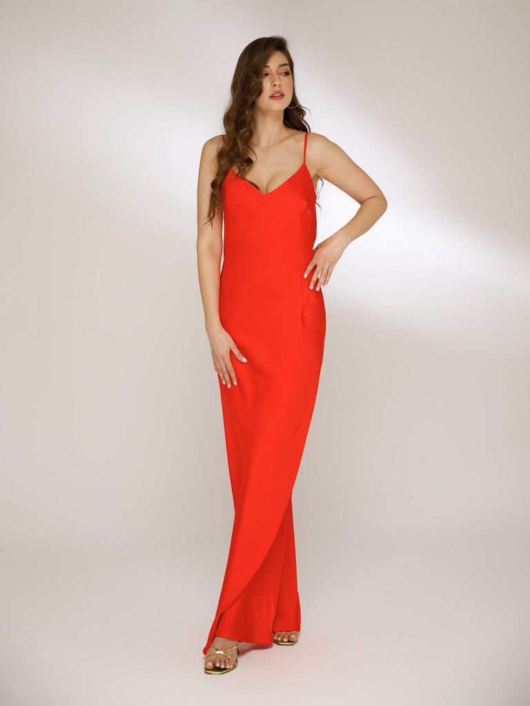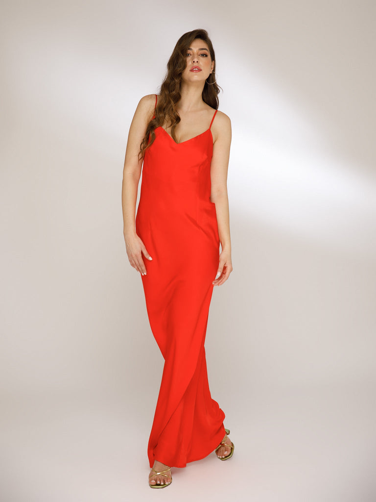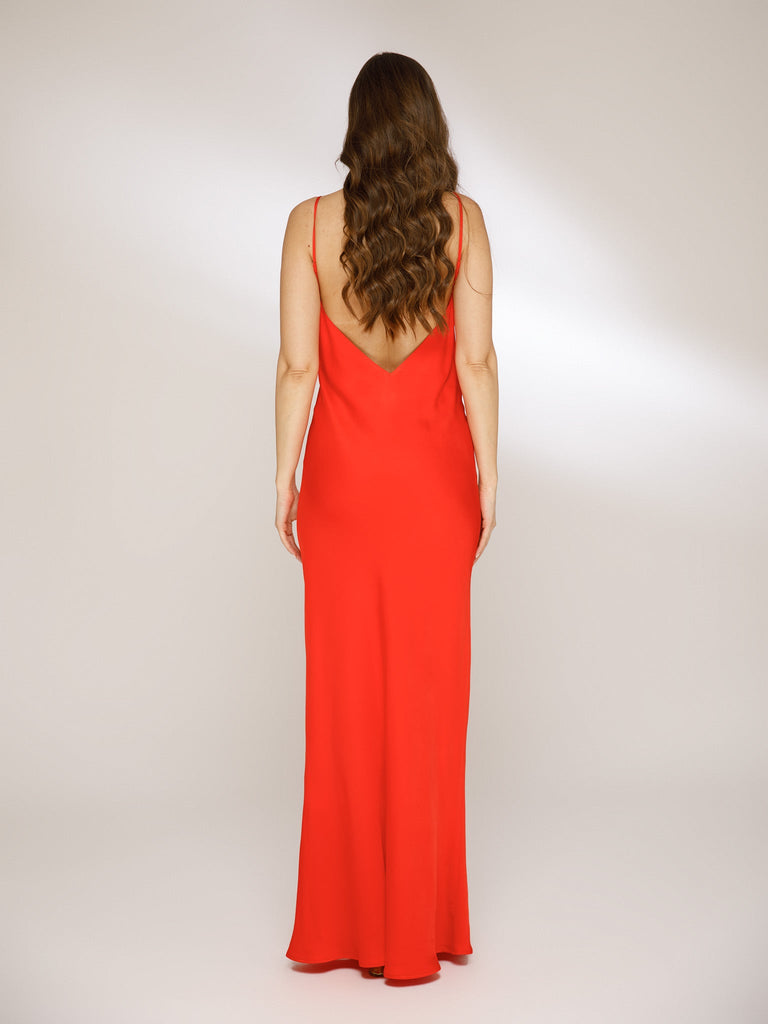 The long dress with a bare back has a bias cut and straps with rings to adjust the length.