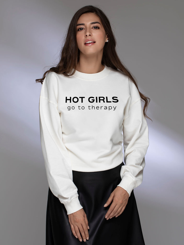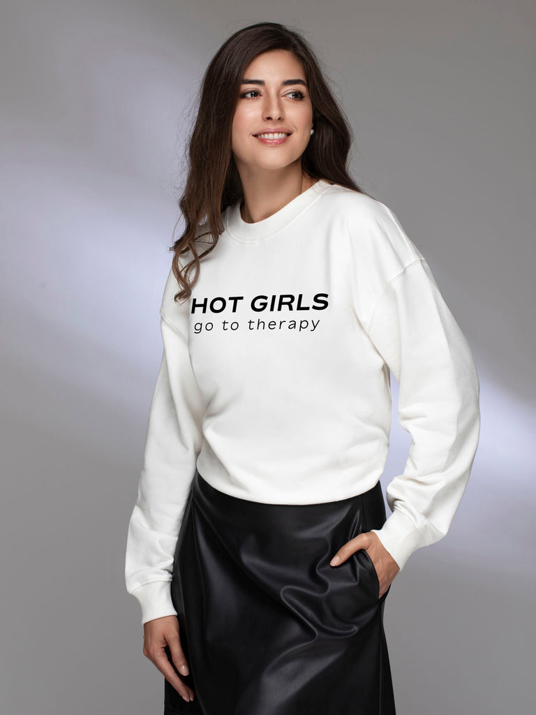 White organic cotton sweatshirt with velvet print HOT GIRLS GO TO THERAPY