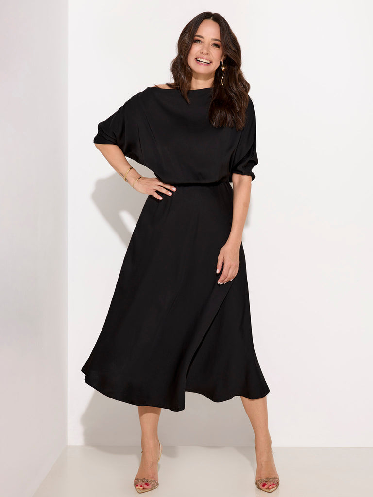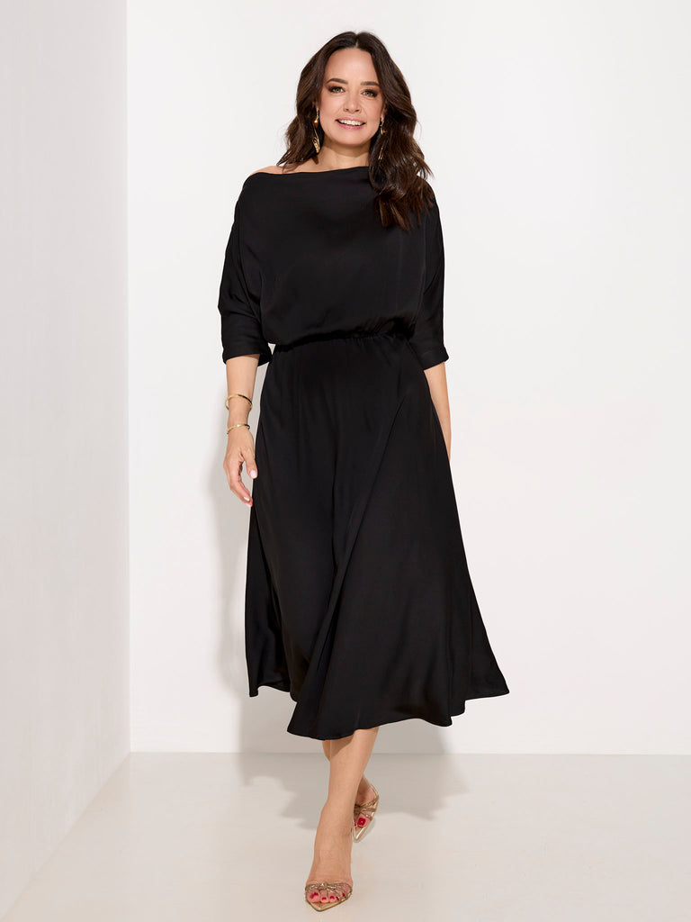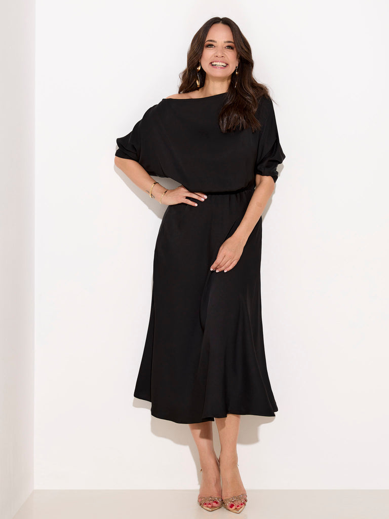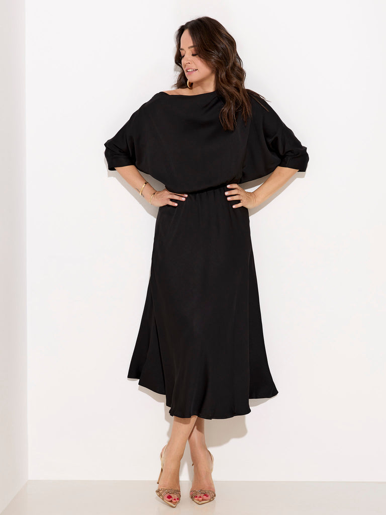 The Bella dress is the perfect choice for a special evening or an elegant event, where comfort blends harmoniously with style. This subtly refined dress is made of glossy viscose, which gives the material a smooth appearance and velvety texture. The cut of the dress is loose, falling gently on the body and following the line of the silhouette, giving it a diaphanous air.