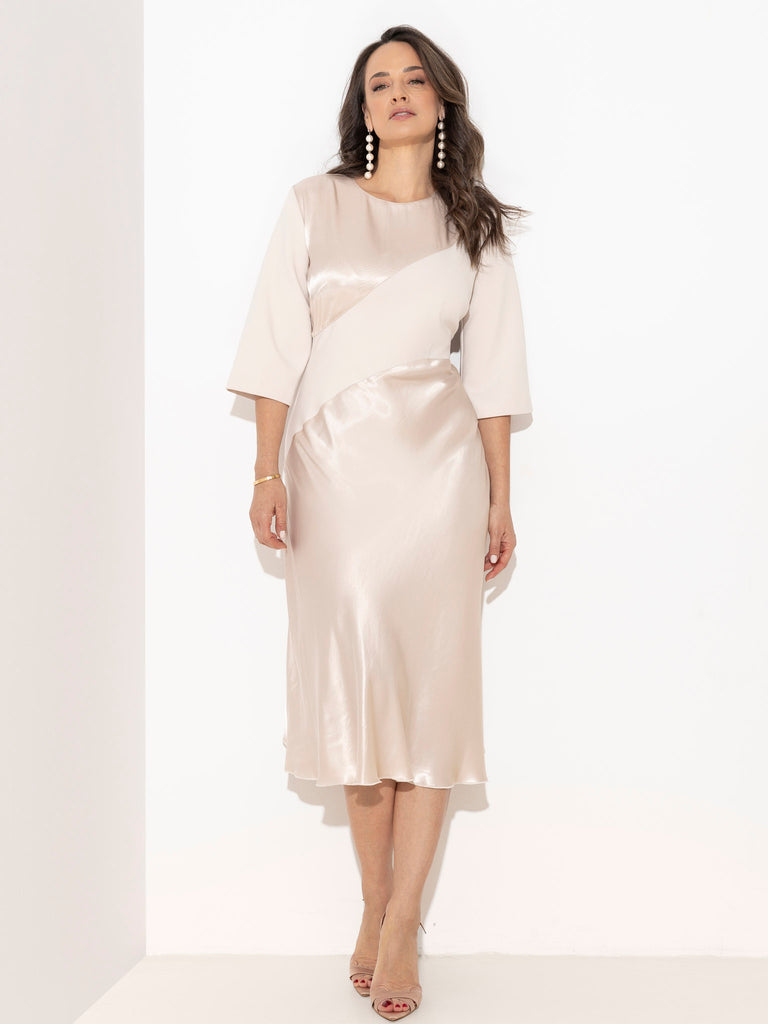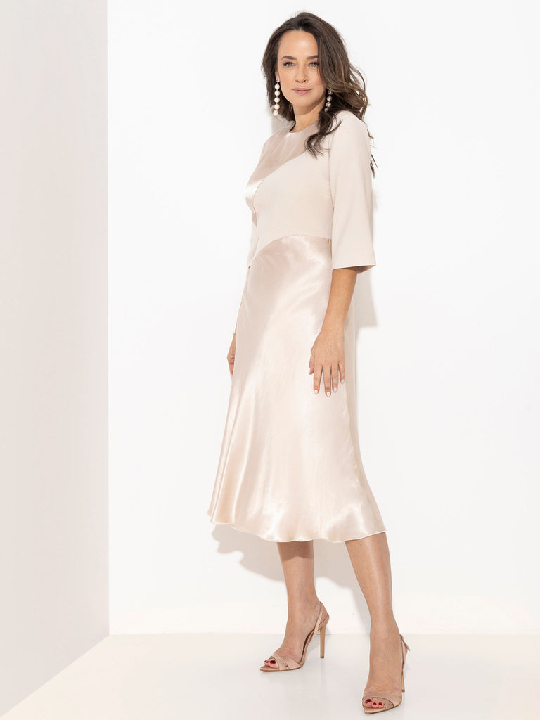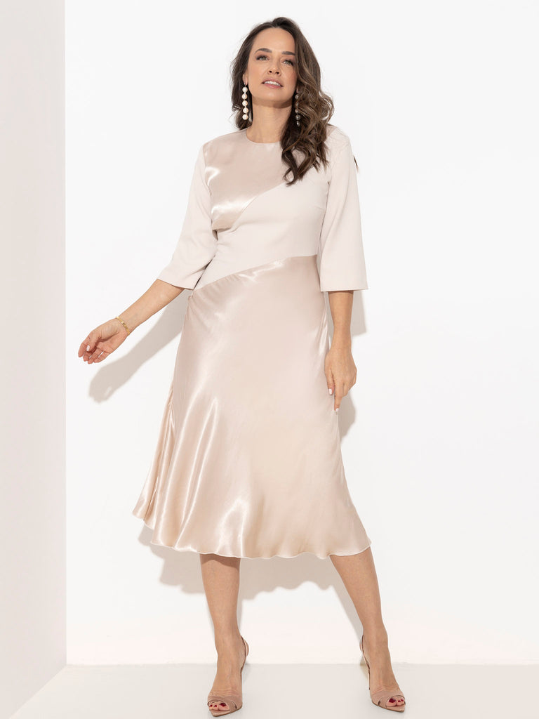 A flowy dress with viscose inserts is a refined and comfortable choice, combining the fluidity and elegance of the flowy material with the finesse of viscose, a material known for its its softness and luster. This dress has a light and delicate design, made of materials that allow for free and graceful movement. It pairs perfectly with thin-heeled shoes or sandals, which add elegance and emphasize the fluidity of the dress, making it ideal for a spring evening or a special event.