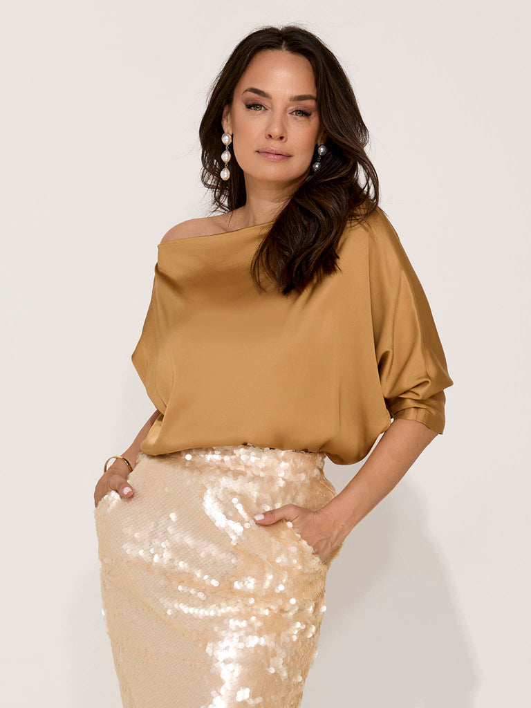 Grace blouse in golden viscose – with open shoulder and elegant drape | Amalin – Andreea Raicu
