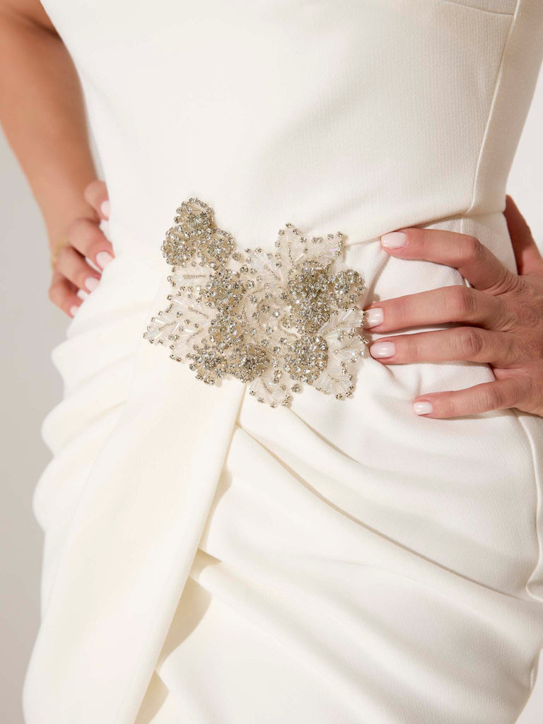 The Tiffany Dress is the perfect choice for refined, elegant occasions. Made from a premium, smooth-textured fabric, this dress stands out through its feminine silhouette and wrap-style lower cut that adds grace and elegance to your figure. The central crystal embroidery detail brings a touch of glamour and subtly draws attention to the waist, enhancing it beautifully.