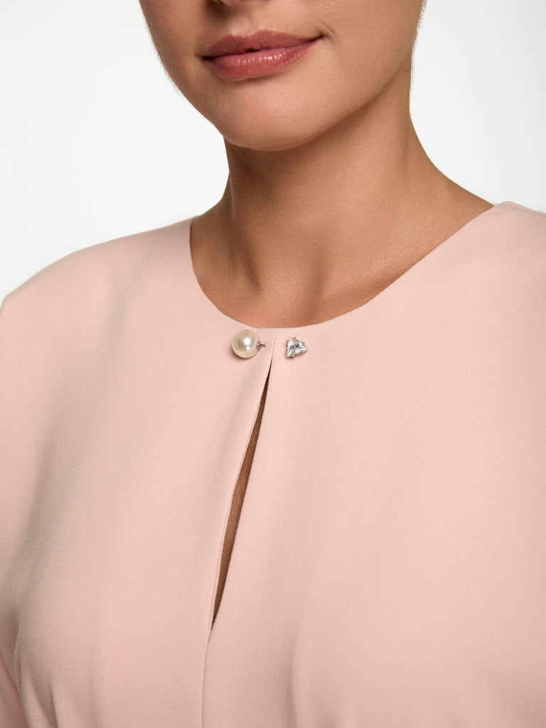 Rochia Amelia aduce impreuna feminitatea clasica si accentele moderne printr-un detaliu subtil cu perla si cristal in zona decolteului. Cu o croiala conica, maneci 3/4 si nuanta blush sofisticata, este alegerea perfecta pentru evenimente in care eleganta fara efort este cheia.