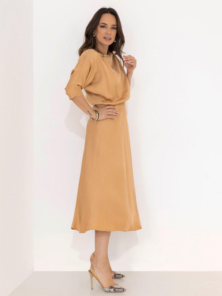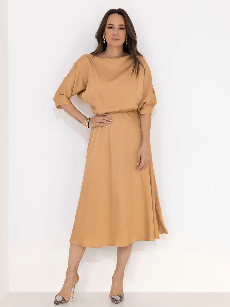 Rochia Bella este alegerea perfectă pentru o seară specială sau un eveniment elegant, unde confortul se îmbină armonios cu stilul. Această rochie de un rafinament subtil este realizată din vâscoză lucioasă, ce conferă materialului un aspect suav și o textură catifelată. Croiul rochiei este lejer, lăsându-se ușor pe corp și urmând linia siluetei, dându-i un aer diafan.