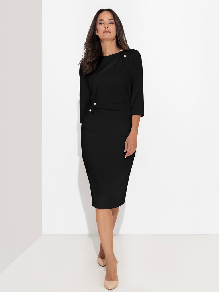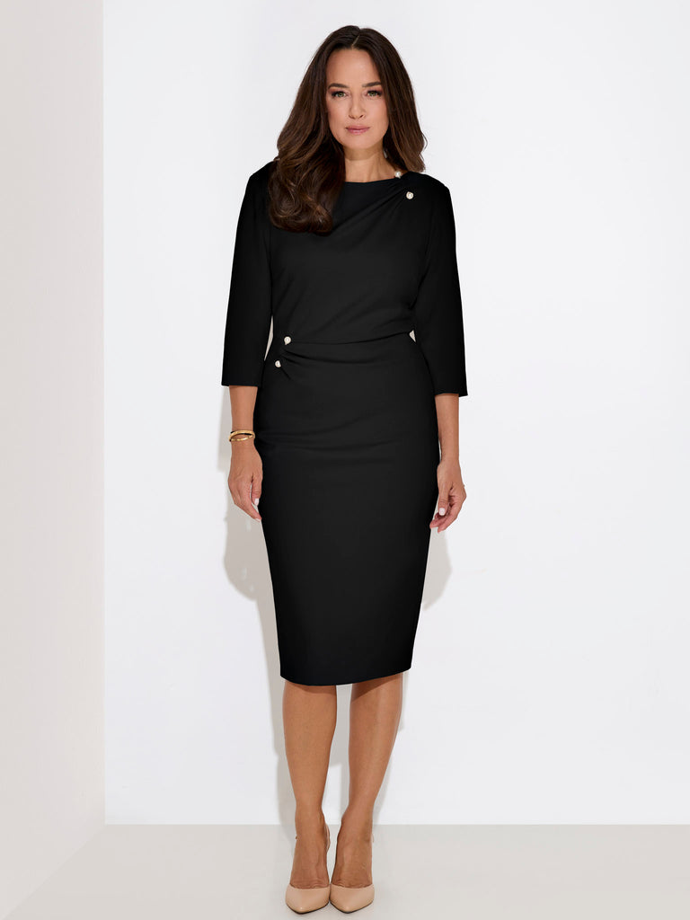 Rochia Claire impresioneaza prin simplitatea sofisticata si jocul subtil de pliuri decorate cu perle. Cu o croiala dreapta, talie marcata si maneci 3/4, este alegerea ideala pentru femeile care cauta eleganta fara artificii. Accentele de perla adauga un plus de rafinament si personalitate.