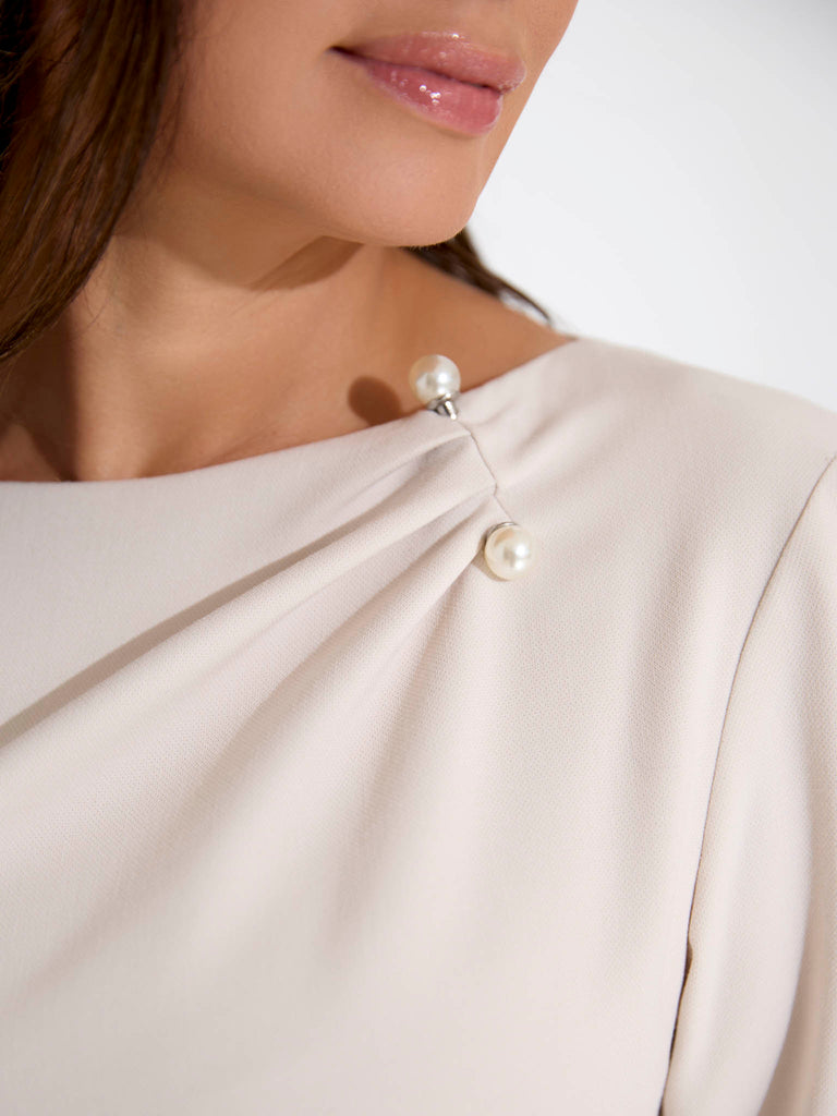 Rochia Claire impresioneaza prin simplitatea sofisticata si jocul subtil de pliuri decorate cu perle. Cu o croiala dreapta, talie marcata si maneci 3/4, este alegerea ideala pentru femeile care cauta eleganta fara artificii. Accentele de perla adauga un plus de rafinament si personalitate.