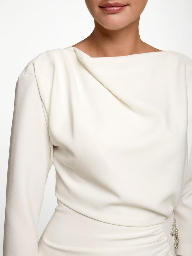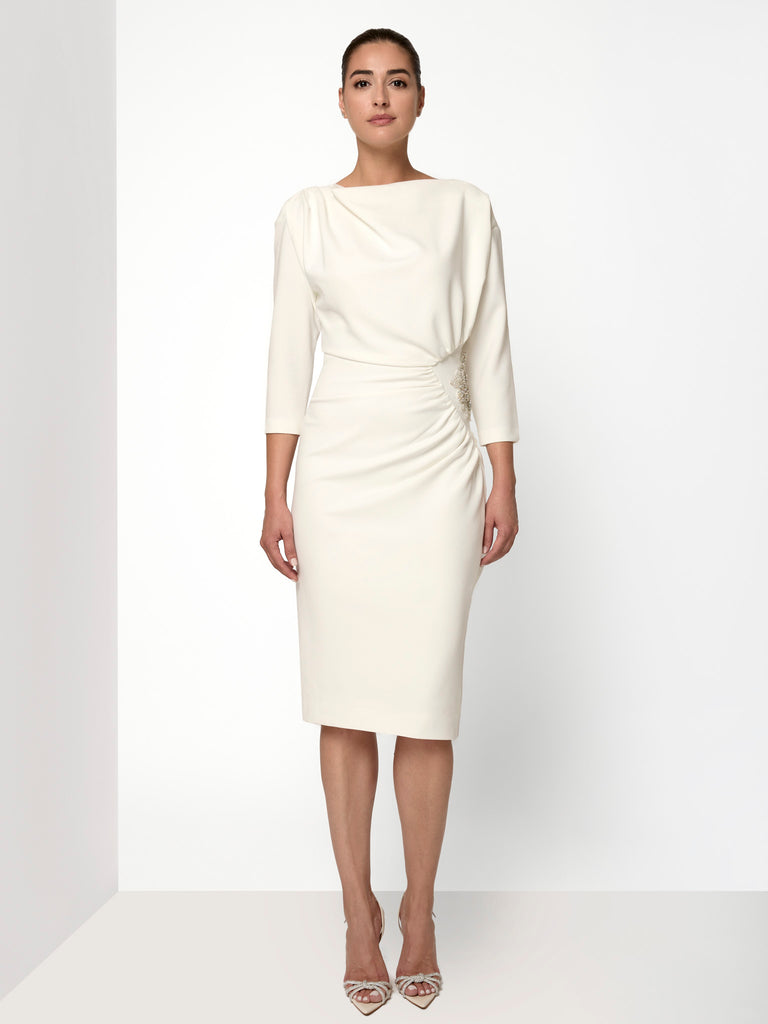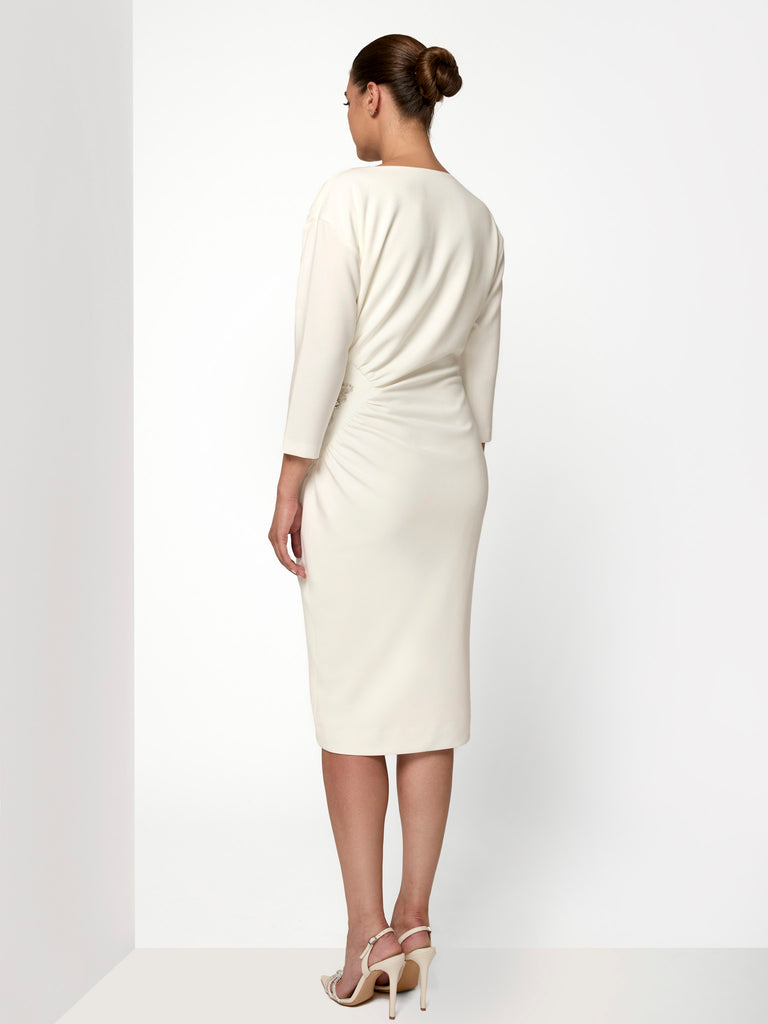 Mai mult decat o simpla piesa vestimentara, rochia Hailey este o declaratie de stil si rafinament. Croita cu maiestrie, pune in valoare feminitatea prin liniile sale impecabile si prin detaliul brodat manual cu cristale ce adauga o nota couture de impact. Rochia Hailey imbina minimalismul modern cu accente de lux atemporal, creand o aparitie ce emana siguranta si gratie. Materialul fin aluneca delicat pe silueta, in timp ce manecile trei sferturi si lungimea midi confera un aer sofisticat si perfect echilibrat.